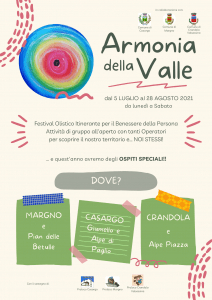 Quest’anno la fascia oraria degli eventi si estenderà anche alla sera e sono previsti tre pomeriggi esperienziali (dalle 14.00 alle 19.00), conclusi da una concerto serale, con il seguente programma: sabato 10 luglio a Casargo – Armonia dei Corpi, sabato 24 luglio a Crandola e Alpe Piazza – Armonia della Natura, sabato 7 agosto al Pian delle Betulle – Armonia dei Colori.
